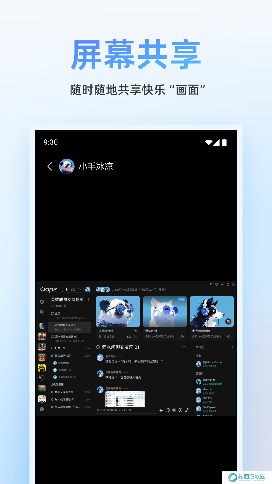 Oopz支持在这里进行移动端的屏幕共享,让每位玩家都可以随时随地与好友分享精彩瞬间。并且该app还实现了多端互联,支持移动端与PC端(客户端/网页端)同时登录,让你随时随地畅享游戏语音乐趣。